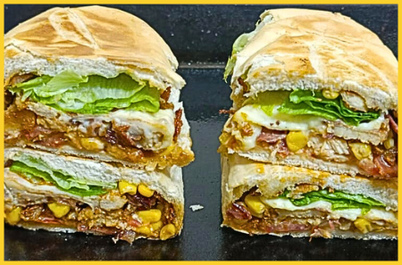 Pão, Filé de Frango,Queijo, Batata Palha, Catupiry, Bacon, Milho, Alface, Ketchup e Maionese.