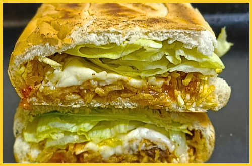 Pão, Filé de Frango, Queijo, Alface, Vinagrete, Ketchup e Maionese.