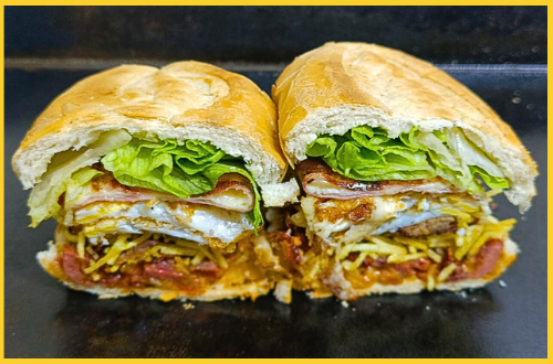 Pão, Contra-Filé, Queijo, Presunto, Bacon, Ovo, Alface, Tomate, Ketchup e Maionese.