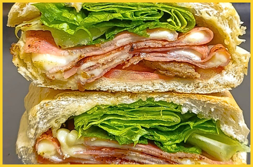 Pão, 5 Fatias de Queijo, 5 Fatias de Presunto, Alface, Tomate, Ketchup e Maionese.